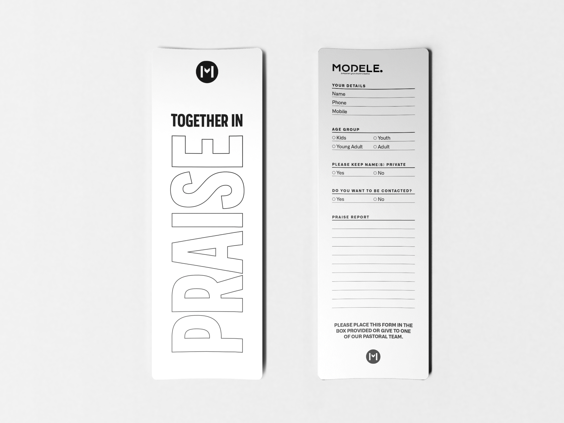 A simple black and white bookmark design. Easy to read and to fill out. colours can be changes and the text is editable. This design can work well with the black Feedback and Prayer Cards.
