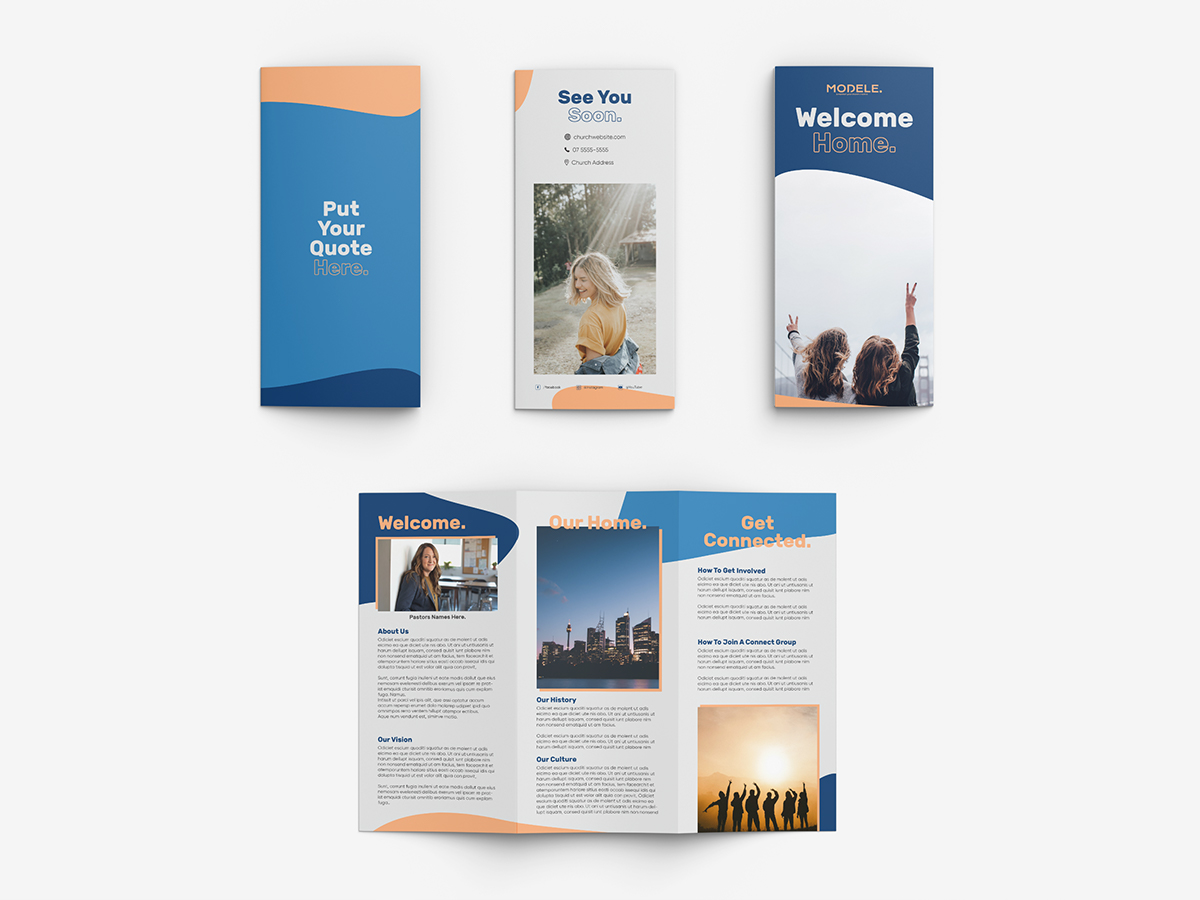 A beautiful generic A4 design folded to DL. The curves of the shapes flow fluidly from one page to another. There is plenty of space for images and text, still retaining a modern and clean design.