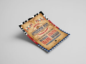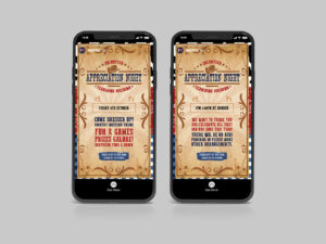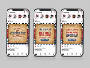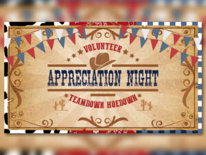 A hoedown event to celebrate your team or just to have fun. This design is fun, bright and busy. Torn vintage paper, cow print, cactus and typically country western fonts.