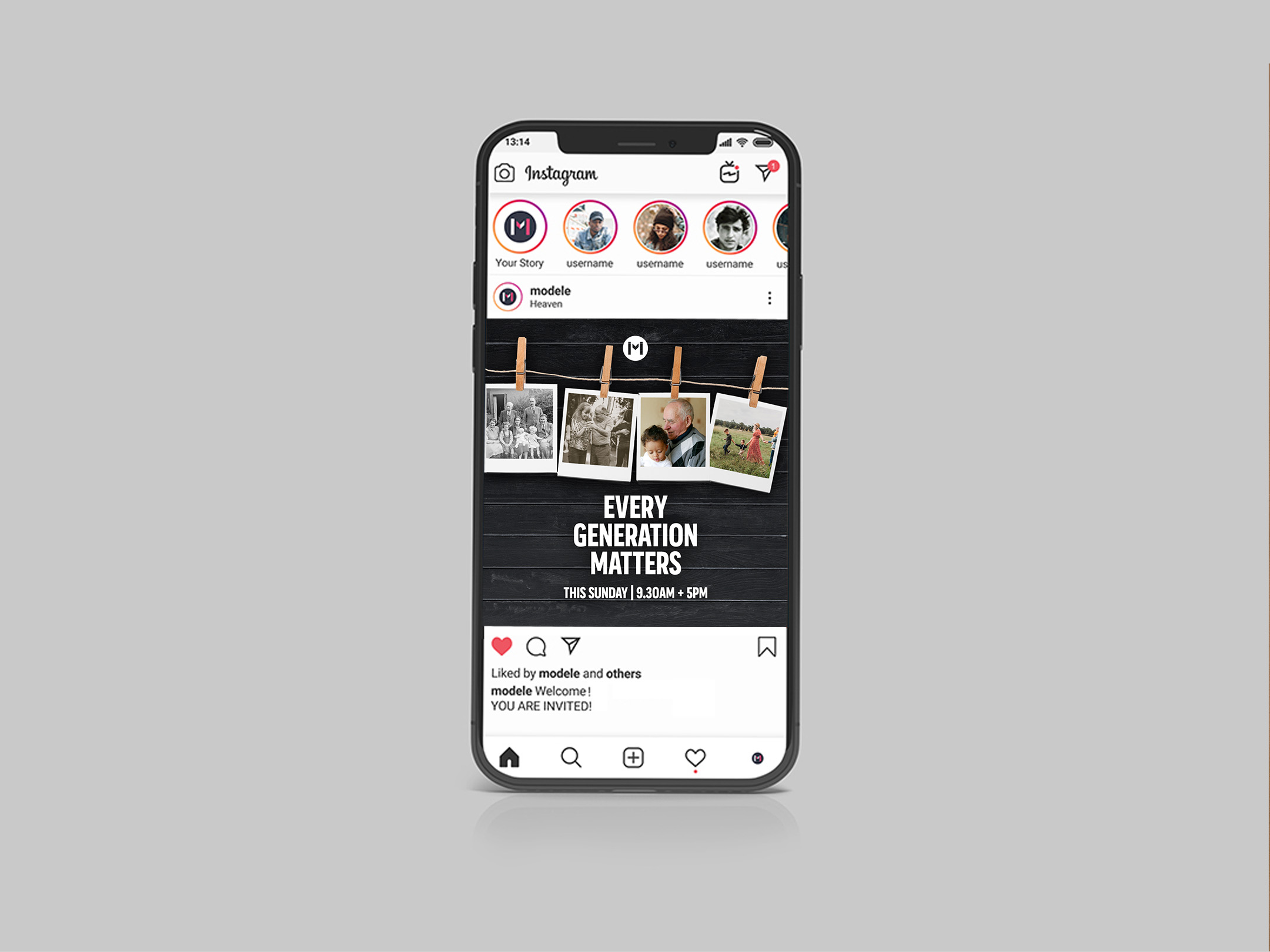 Polaroids strung up along a piece of string showing a range of different generations. From the old to young, every generation matters. A black wooden slated background gives a natural DIY feel.