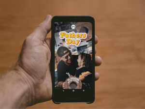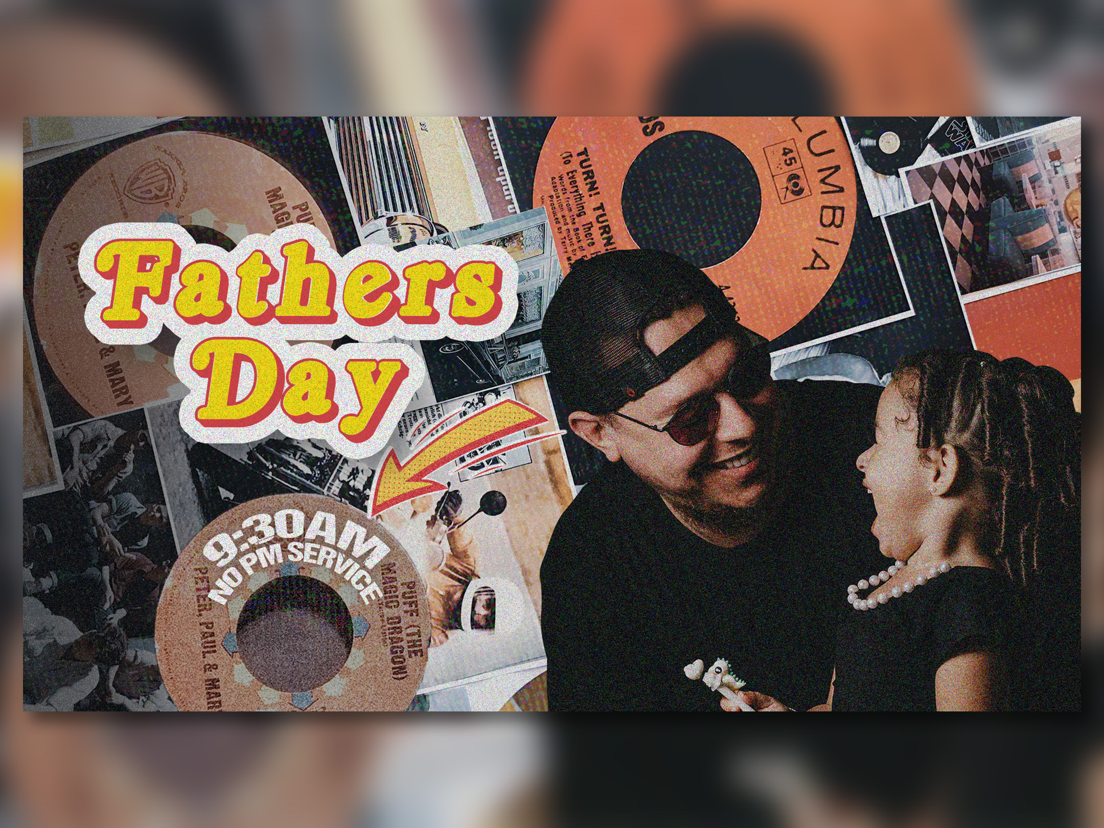An old-school retro masculine design. Everything a father loves… his children and of course bikes, cars and music. A collage of images form the background to a gorgeous photo of a father with his daughter. A light grain texture overlay.