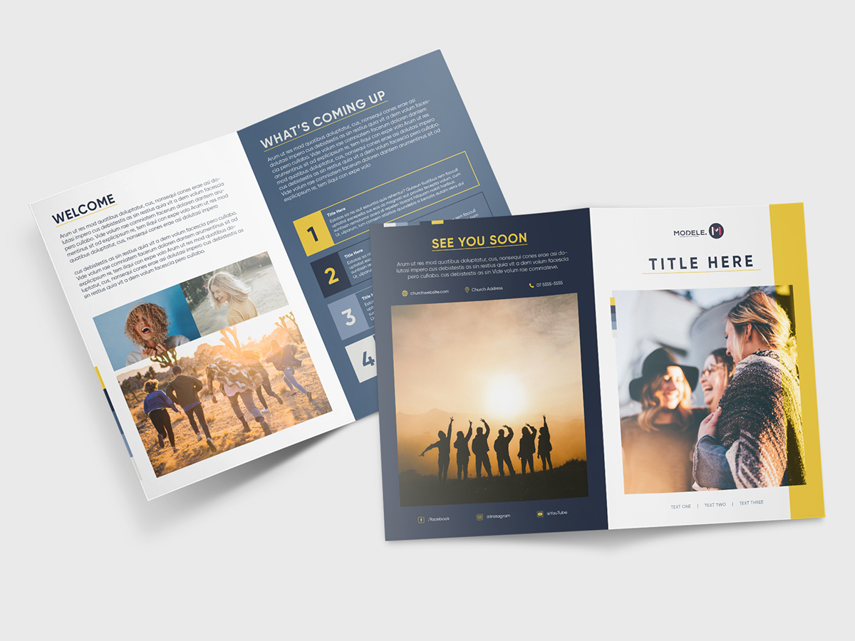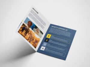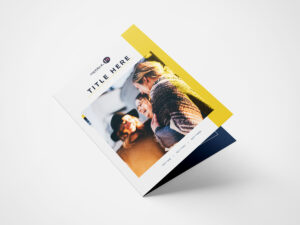 A smart A4 folded to A5 newsletter that can be adapted to suit your individual branding. Blue, white and yellow are warm and inviting. The use of imagery forms a connection with the reader, while still allowing the information to be key.