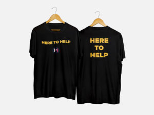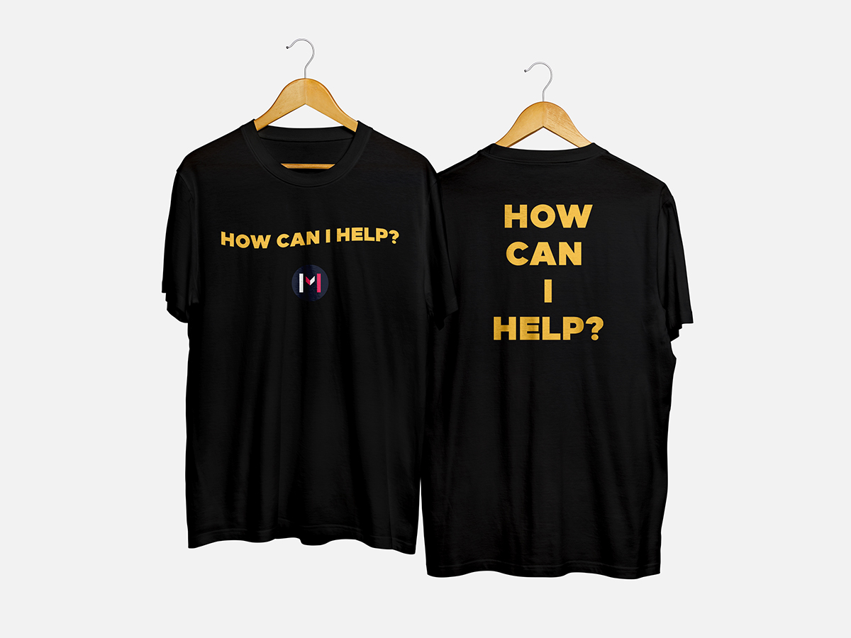 A black T-shirt with yelow text and your church logo. How can I help? Here to help. Simple words but an effective way to be visible to people visiting your church and are unsure of where to go.