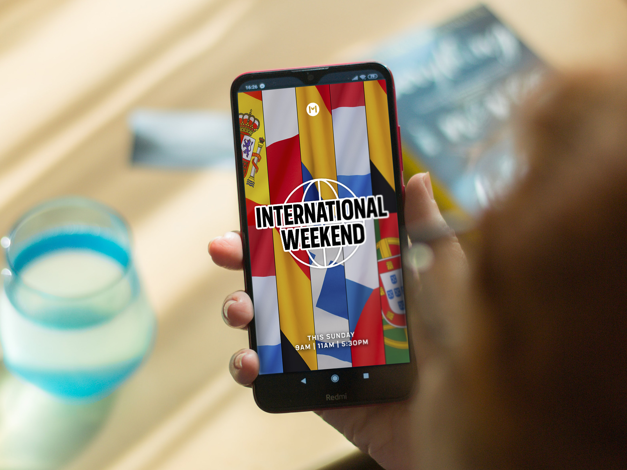 A global celebration of all the different cultures within the church. Bright and colourful flags from around the world form the background. A iconic symbol of the glob integrated with text form a clean and modern logo.