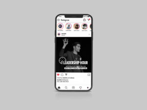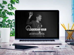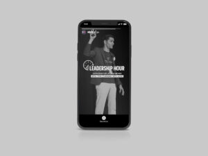A clean and simple design of a linear clock with a bold typeface set on a black and white image of the guest speaker.