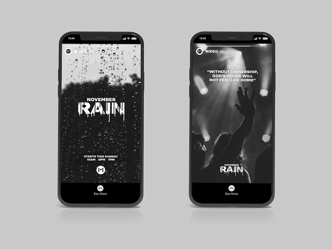 A series where the month of November is dedicated to teaching and praying for the Holy Spirit to ‘Rain’ down on the church and community. The design shows rain drops representing the Holy Spirit pouring down on us. A high contrast black and white image coupled with photography of hands raised and people worshiping.