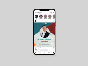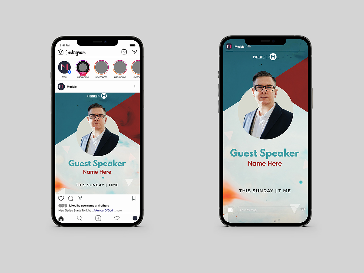A modern clean design advertising the details for the next guest speaker. Shapes and textures complement the use of space and information.