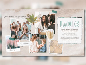 A beautiful design celebrating women. Torn paper, polaroids and dried flowers are scrapbooked together in a uniquely stunning design. Photographs of women from within the church can be changed for images from your own church. Each element is free floating and can be moved around.