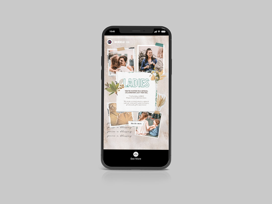 A beautiful design celebrating women. Torn paper, polaroids and dried flowers are scrapbooked together in a uniquely stunning design. Photographs of women from within the church can be changed for images from your own church. Each element is free floating and can be moved around.